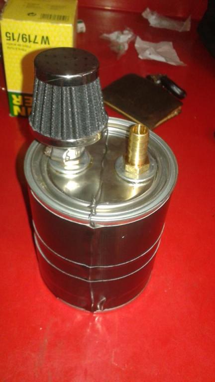 just a new empty small paint can, two hose barb fittings, two locking nuts with holes for oil to go through, some washers and gasket maker and a cheap breather filter from autozone.