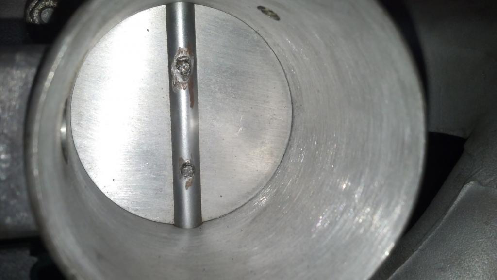 Here is a pic of the throttle body I got from bobross here on r3v. It's bored and has had the throttle plate swapped with a proper sized replacement. The screws go in from the other side and have been staked to prevent them from coming out.sigpicComment