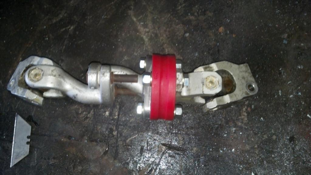 So I'll be replacing the rag joint in the steering column. It's being replaced with an I.E. poly unit. The last pic shows the column partially cut apart, I used a die grinder to cut the heads off the rivets holding the rubber to the aluminum halves. And then an impact hammer to drive the rivets out. This pic shows the rubber and rivets almost all the way out.sigpicComment