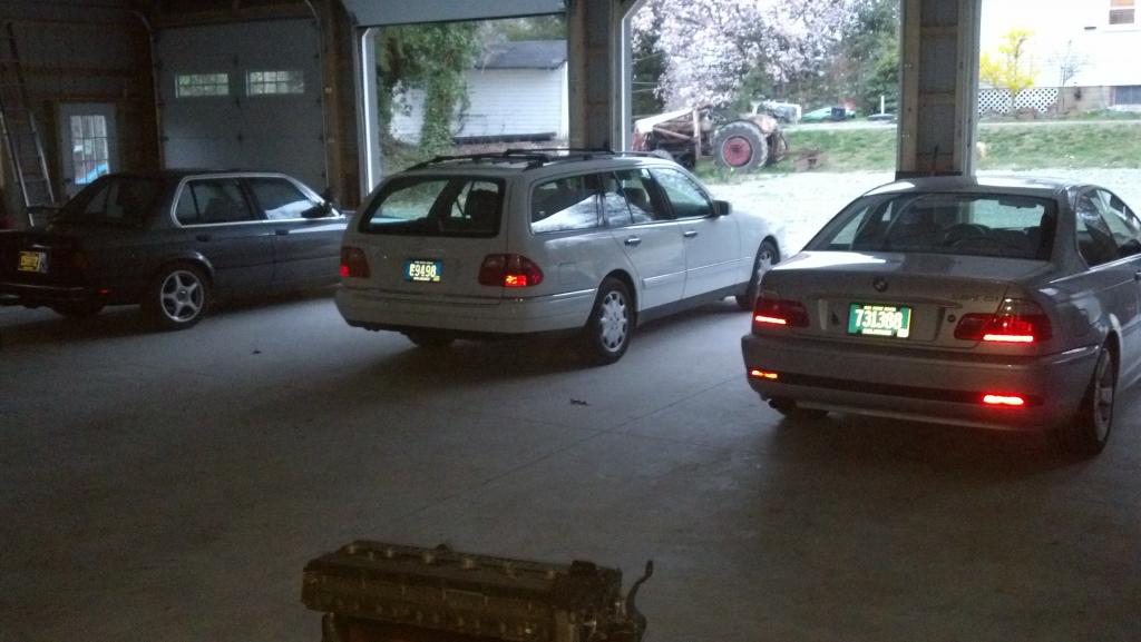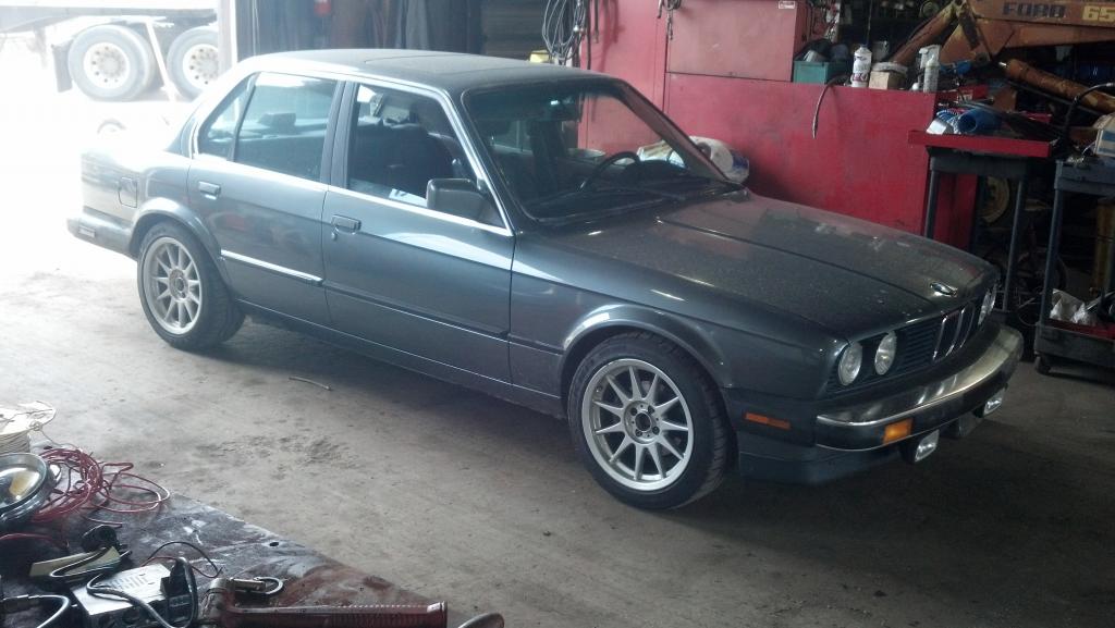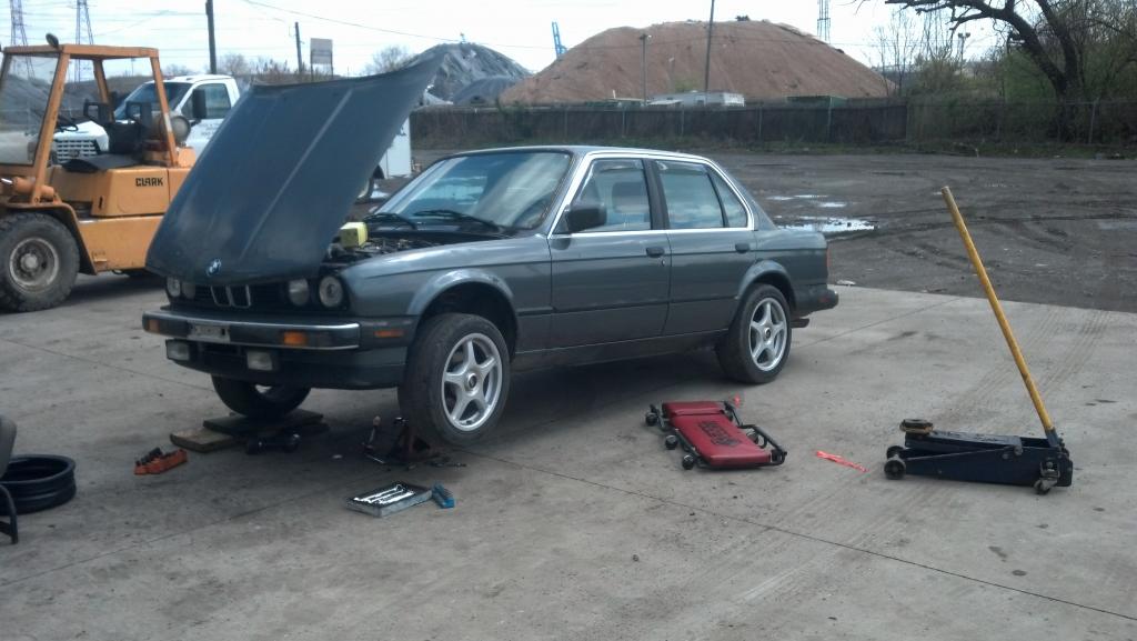 I'm letting my brother use my stock setup because he is in the middle of swapping to a 90 e30 w/s50 and his current setup has pretty leaky pipes. Here is what we are removing from his car.