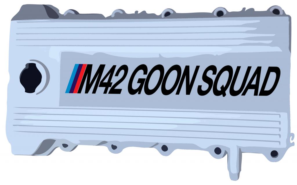 I thought it would be cool to have a sticker with 'M42 Goon Squad' written on the valve covers spark plug cover. May be a little too complicated for a sticker and I couldn't really find a good valve cover pic, but you get the idea.