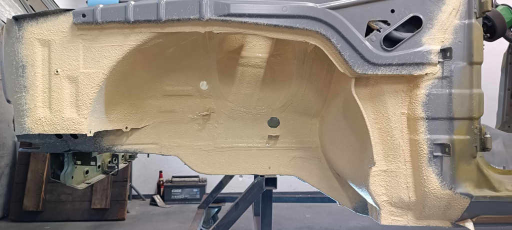 As of now the whole car has been weld fixed and many body parts mended/upgraded, etch primed, primed and Polyurethane sprayed.