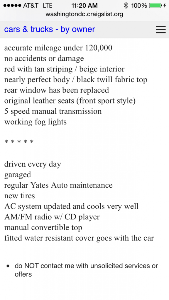 Needless to say I went to go see this car as soon as I could. The 71 year old owner has had it for 6 years and kept it garaged and covered. The interior is fair (normal rips in the drivers seat and a broken seam in the rear seat I can repair).