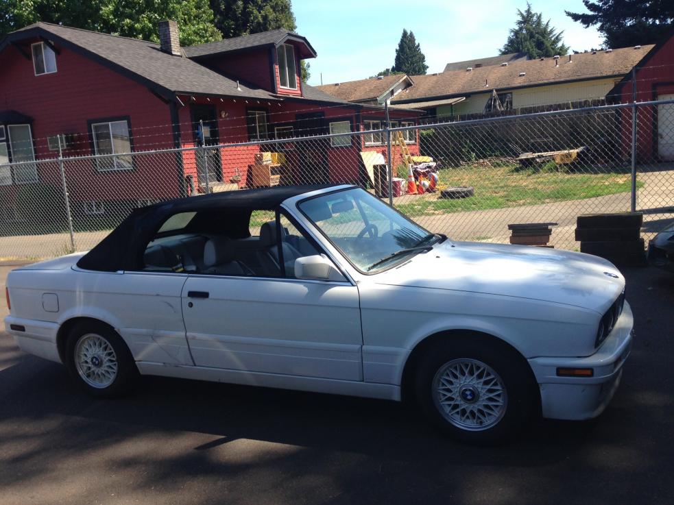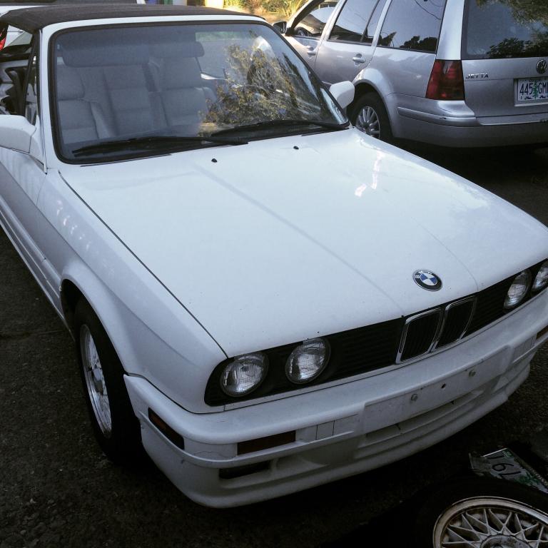 Monday was a very long day for me. I couldn't get the thought of the car out of my head. The whole day, I was spacing out and not able to focus. As soon as 5 pm hit, I was out of there and racing home to change. As soon as Kristin, my gf, arrived home, we jumped in Eleanor (my Lachs 330is) and headed out to SW Portland to view the car. We pulled up to the seller's house and I knew as soon as I saw it, this car was going to be mine. I walked up and greeted the seller and started my inspection. The car had all original panels and hasn't appeared to be in any major collisions, but there was some clear peeling on the bumpers, which indicated a respray to me. Fine. Seats weren't ripped, but weren't great either. Fine. Top had a hole sliced in the back corner and the window was cut. Fine. Engine hadn't had a timing belt service since at least 2004. Fine. Among all the other small, stupid, typical E30 issues, the car was super solid body wise, and was exactly as the seller described it. As I stood there admiring the car - the gorgeous Lotusweis interior, the finish of the Alpine basketweaves, the asthetics of the M-Tech kit - I thought to myself "what the hell am I doing here right now? Why am I taking on yet another giant project?", as I literally just finished my two year long build not even a week ago. As a wise man once said: "Life is simple - you make choices and you don't look back."