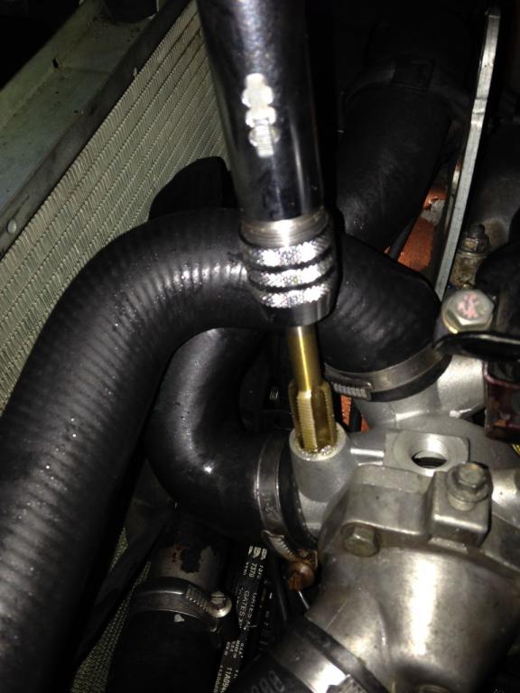 Here's that lousy replacement thermostat housing and its extra holes. Not exactly sure what size they are, but they're pretty close to m14x1.5, which is how I made the screws. So I'm tapping them in that size to ensure the fit. The shavings are mostly trapped on the tap, but I'll have to go in there and clean it out some more.