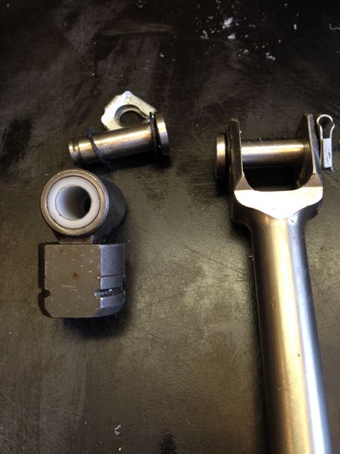 So I drilled out the old wallered bushing, and happened to have some very nice 'Murican-made Delrin rod. Shaved it down to size in the lathe, and drilled it for the 10mm pin. Pressed it in, cut it down to size, and walla! I can say "walla" because I'm not only from Missourah, but more precisely St. Louis, which had a lot of French influence back in the day. Hence, the frog-speak.