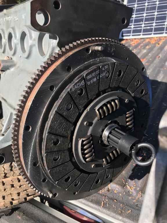 Plugging away: The prior transmission had a "Getrag rattle" (not the T.O. bearing), and I'm hoping this one doesn't. Flywheel was machined, and I put in a fresh clutch and pressure plate. Bolting it up to the backup 2.7 stroker, while using the fasteners from the prior engine, I discovered it was missing more fasteners (a recurring theme), including a pretty important 12mm engine to tranny bolt. Nice.