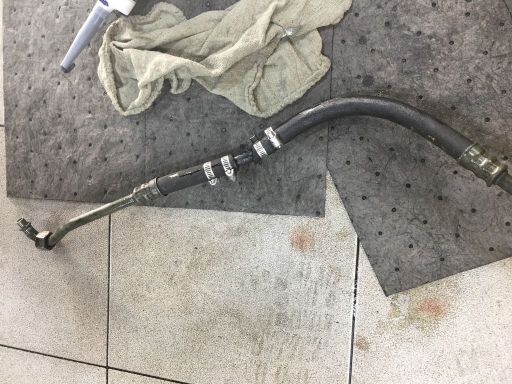 Here's the rigged up trans line someone thought wouldn't leak. Rubber hose inside a rubber hose.