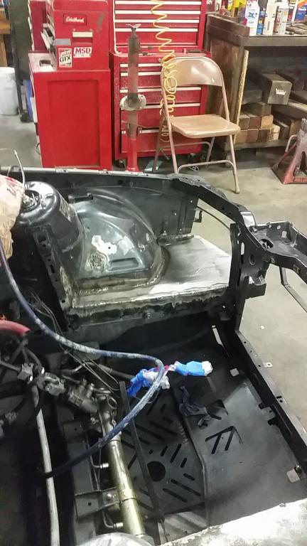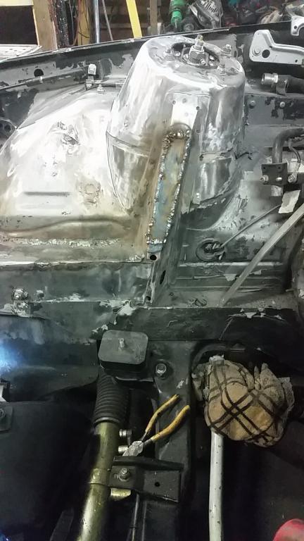 I got the panel at the bottom of the shock tower welded in. I have a couple of questions though it seems like most people weld it completely in then grind out the welds and then bondo over the welds at the seams, it sure looks good but my concern is having it crack overtime, id like this to be quality and last along time for shows for years to come, any input from people who have done this? Seam sealer would be nice but i want the bay to look like glass and completely smooth