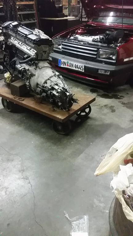 Pic of the engine out along with my old 1.8t jetta coupe in the back
