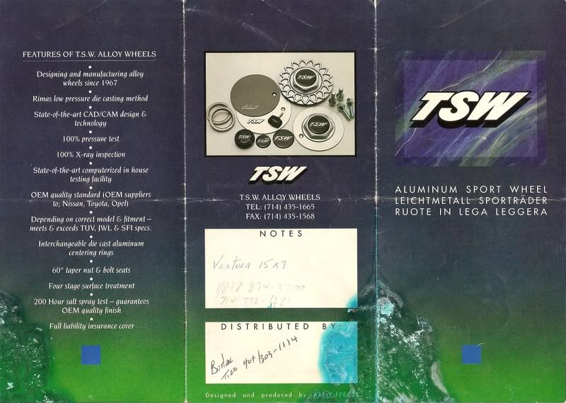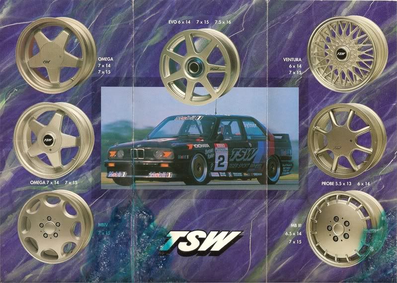 Ha, thanks. They're 15" x 7" TSW Ventura wheels. I actually found the receipt from the place that installed them back in November 1992, they retailed for $168 per wheel. I also found the actual TSW wheel model brochure with those Ventura wheels featured in there.