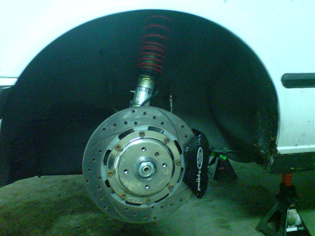 Wilwood 4 piston race light calipers and 11.3" rotors. As for suspension I am running H&R coilovers with H&R sway bars front and rear.
