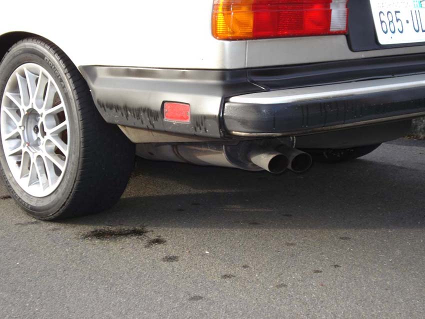 So I finally got this I exhaust on, mainly cause my muffler was rusted out and had tons of holes in it. Started to sound like ass and I got the whole exhaust pretty cheap from smonkbmw. I also got a set of rims pretty cheap off craigslist. They were on this extremely generic ad with no pics so I e-mailed em askin for a pic and I went and picked em up yesterday for $220 with tires. They're a 16x7, unknown brand. Tires are a 205/55 but they're kind of low on tread so soon I will get some 205/45's. They kinda jacked the car back up again. Any clues as to what these rims are? They came with 3 center caps but they had a BMW logo on em and the only thing I saw on the rims was a made in Tawain. Paint will be soon and I can get my Zender rear lip on and my ES front valence.