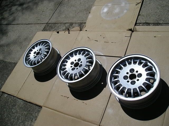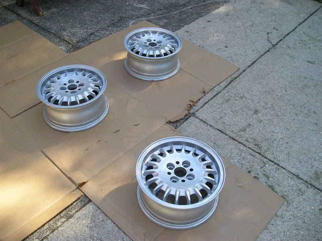 Some pics if the wheel refurbishing on the three I started last night: Duplicolor silver metalic, and I will be applying clear coat this evening in my home made booth in the basement. It is not an OEM color, but it will be clean :)