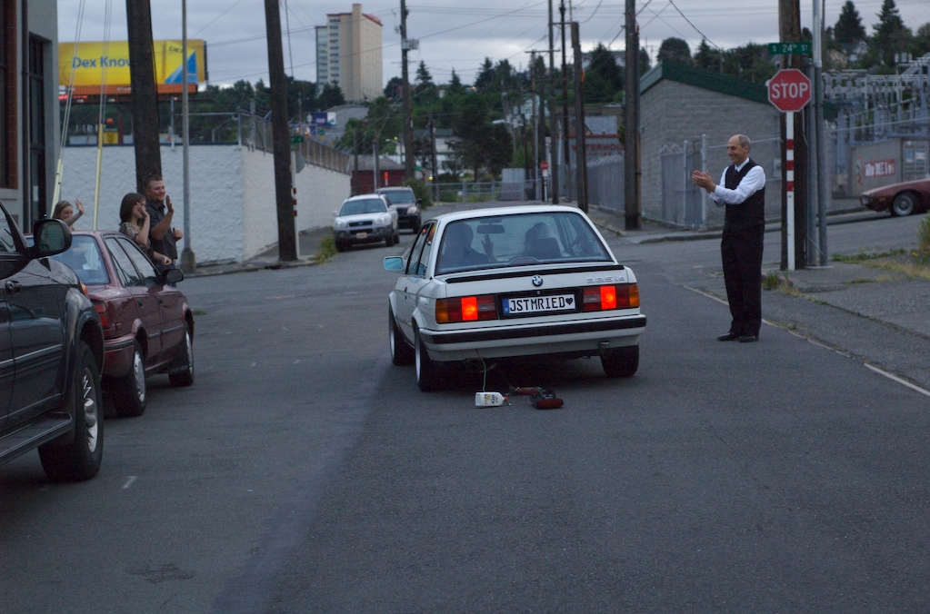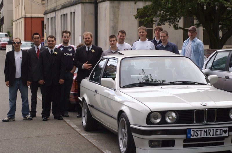 If you notice there are e30s parked around mine as well. We had reserved e30 parking at the wedding that was right out front. As the wedding was getting started the pastor and I were out looking at them and I was telling him all these cool mods about my car and the others that were out there. We got yelled at to get inside so we didn't miss anything. ;)