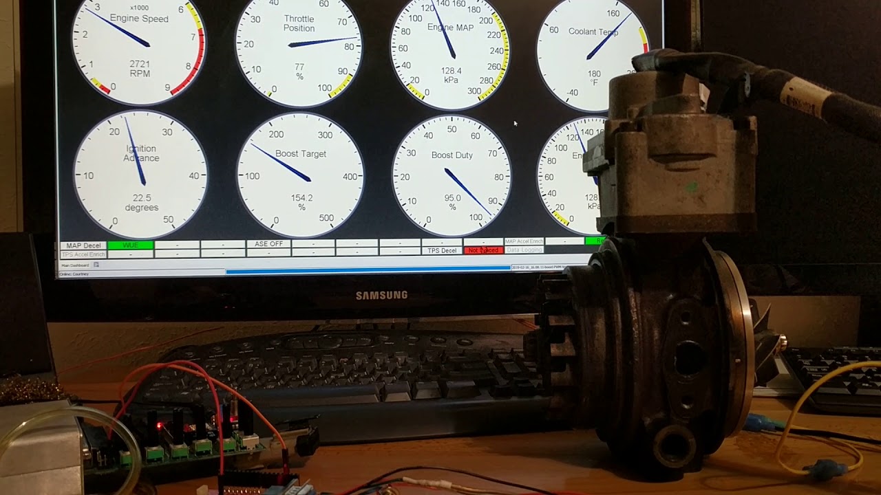 Previous owner was a mechanic at a dealership, a "pro," technically. Said he had torn down the motor to check everything, and it all looked good so he put it back together with an 885 head. Came with some large diesel turbo, a 666Fab turbo adapter (using stock cast manifolds), a partially-built MS2 with V3.0 PCB, front-mount intercooler, a Getrag 260, 2.5" aluminum and 3" aluminized steel pipe/bends for fabbing charge piping and exhaust, and a whole mountain of odds and ends. Seemed like he got a good start, I just had to finish it up: turbo plumbing, swap the trans, wire the ECU, etc. Nothing too complicated.