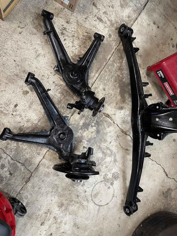 Managed to get the rear subframe cleaned up and painted via rattle can (3 layers rust reformer + 2 layers primer + 3 layers gloss black + 2 layers clear). It took forever to remove all the rust without having access to a blast cabinet. The primary purpose for the paint was to protect from future rust and not concourse level perfection. Also hit my new ANSA exhaust with some high-temp paint to prevent rust.