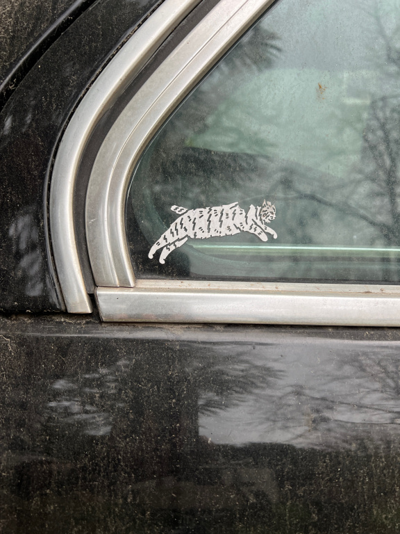I really liked the leaping cat sticker on the window, but sadly during my first trip to the gas station after buying the car, the cat lost its head to the window squeegee. Thankfully my friend had snapped a pic of it. Cleaned it up in photoshop, got it printed and trimmed it out with an x-acto, and voila!