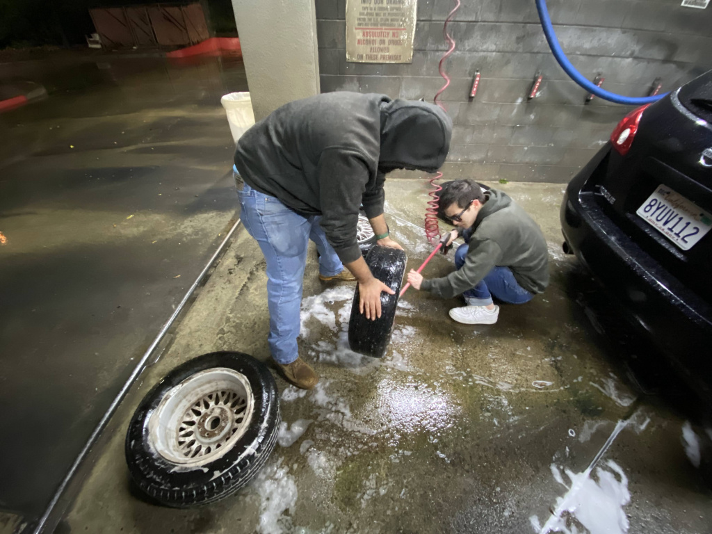 The cheapo XXRs on the car didn't really fit properly and rubbed at full lock, on bumps and made the whole car shake because they didn't have hubcentric rings. They had to go. Brought the original wheels to the carwash to get them cleaned up.