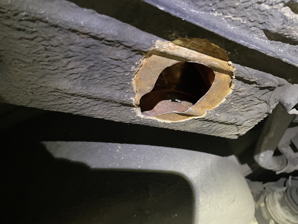 The left side trunk pocket was pretty dirty when I got the car and I soon realized this was due to the power antenna being non-functional and the associated body grommet for it having disintegrated. Pulled out the trunk carpet to gain access to the power antenna and diagnose further and was greeted by this nastiness: Trunk mud and rust as well as upper shock mounts that were toast.