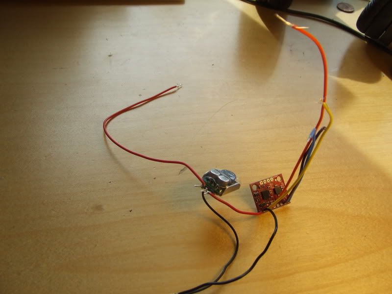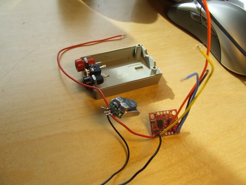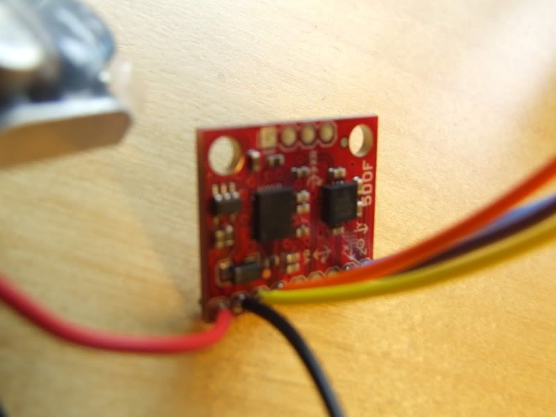 You can see the board and the regulator here. This particular board has outputs for three axes of the accelerometer, two for the two axes of the gyroscope and two for a 4.5x amplified signal for the two axes of the gyro. I've got leads on there for two axes from the accelerometer and two from the gyro. I will only use one output from the gyro and one from the accelerometer.