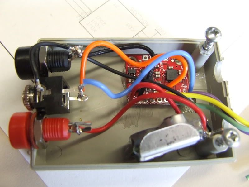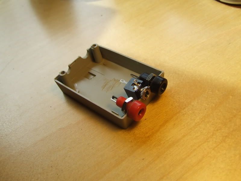 Here is a picture of what I did earlier. Got the board and the regulator in the case and soldered. The banana plugs are for power from the cigarette lighter and the tip/ring/sleeve is for the signal wires that go to the scope.