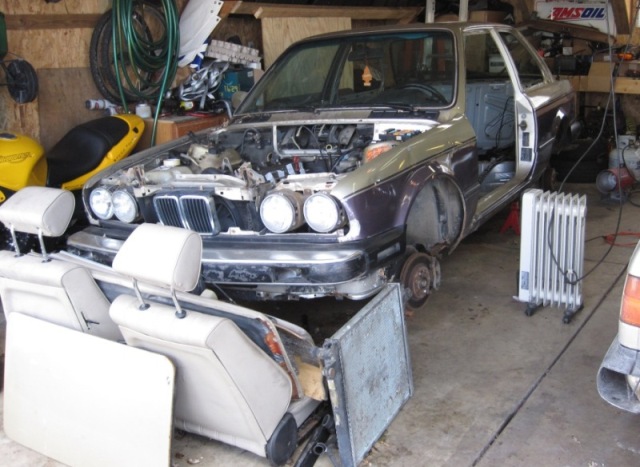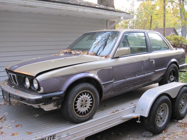 After a few years of being on the fence, I finally decided to join the E30 world and picked up my first. The car is a '87 es. 165K, Manual, well-equipped, LSD, and, um, *whisper, cough* Bronzit.... A few issues that one would expect from a $250 car, but overall decent shape and a good place to start for what is planned.... Looked terrible and dirty when I picked it up, basically looked like a $250 car (especially with the right front caliper sitting in the passenger footwell!). Gave it a bath, vacuumed it out and I think I doubled the value.