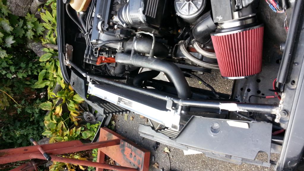 More progress on the black car. The cooling has been the last real issue I have faced in the swap. I had hopes that the small radiator that I mounted within the core support would be able to keep up with my cooling needs but this summer it seemed to struggle a little. Also I was not happy at how close the radiator was to the front of the engine. This required custom radiator hoses. I looked into having silicone ones made up but at the cost of almost a grand to have the two made, I decided to make my own which were rather ghetto rigged. After blowing out a radiator hose I decided "F**k it" Ill make a new solution out of 1/2" schedule 40 pipe.