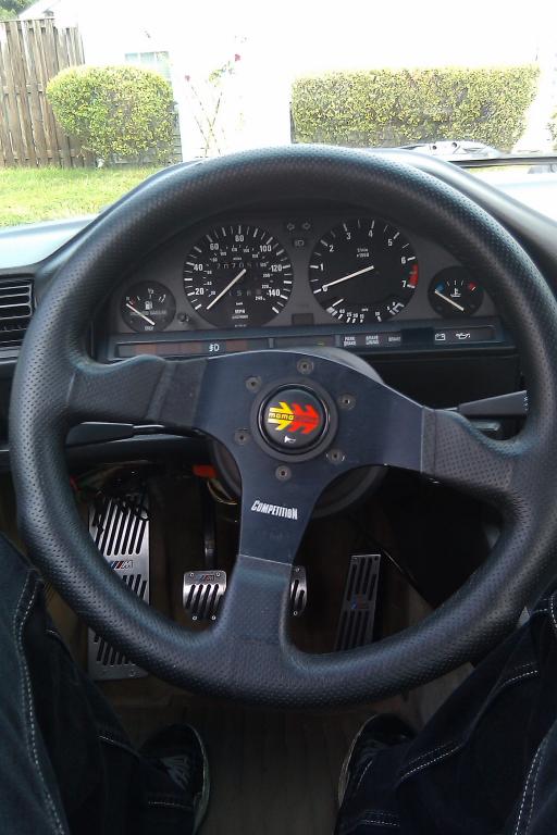 Another cool thing; My neighbor is into cars also so were always helpin eachother out. He just got a nardi wheel in his new car so he gave me his black one for $40. I think its the same size as the grey momo but since its a competition wheel its thicker. Feels solid. and it actually matches..looks so good with the horn on the black wheel instead of the grey wheel