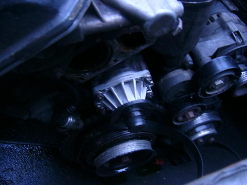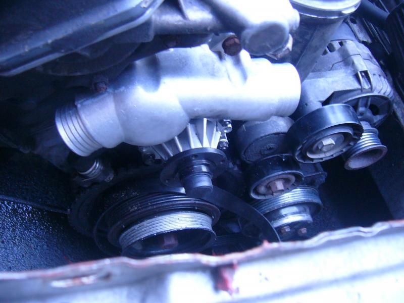 New water pump on. I was prepared for the old one to be stuck on but a few whacks with the rubber mallet and it loosened up nicely and out she came, along with a river of coolant...