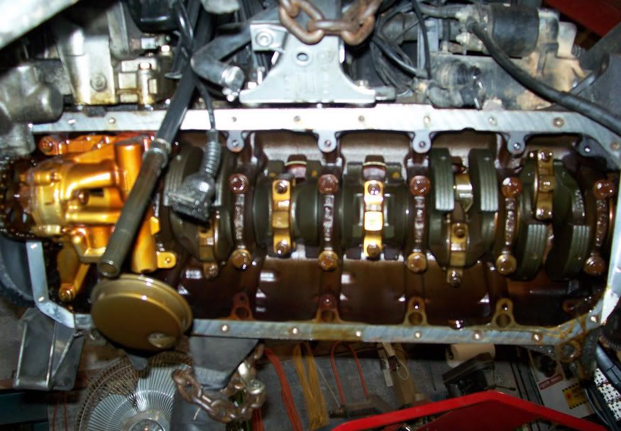 I changed the oil pan gasket while it was convenient to do so. Here is a shot of the bottom end. Pretty clean.