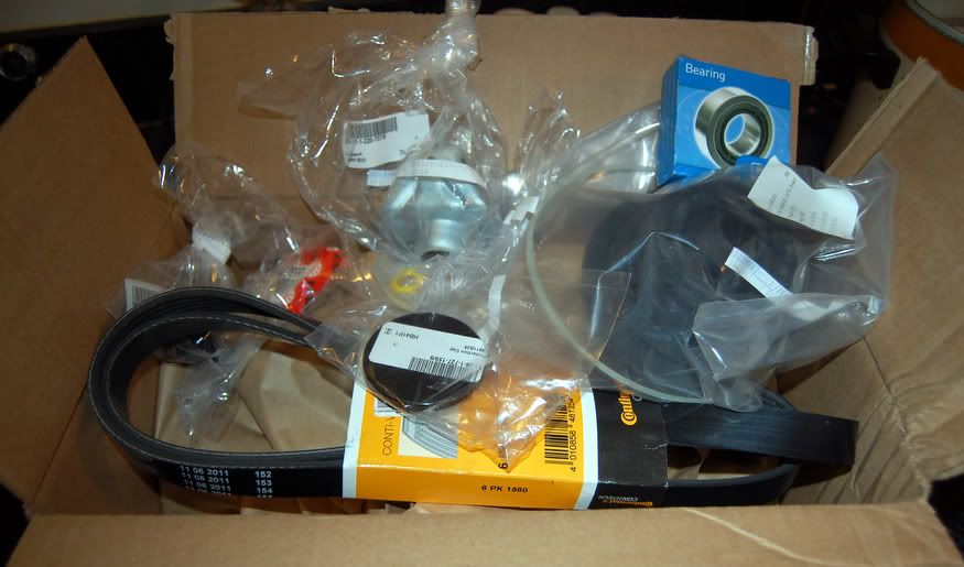 New serpentine belt, idler pulley, thermostat housing gasket, and a lot of scrubbing!