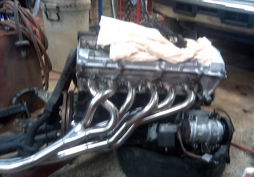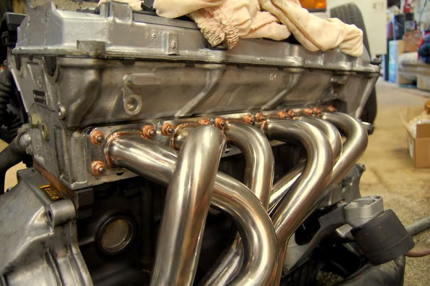 I then started putting the exhaust stud kit on that I got from Turner Motorsports. I had to test fit the headers at this point :) They are quite good looking for $95. I also installed the passenger side e36 engine mount arm.