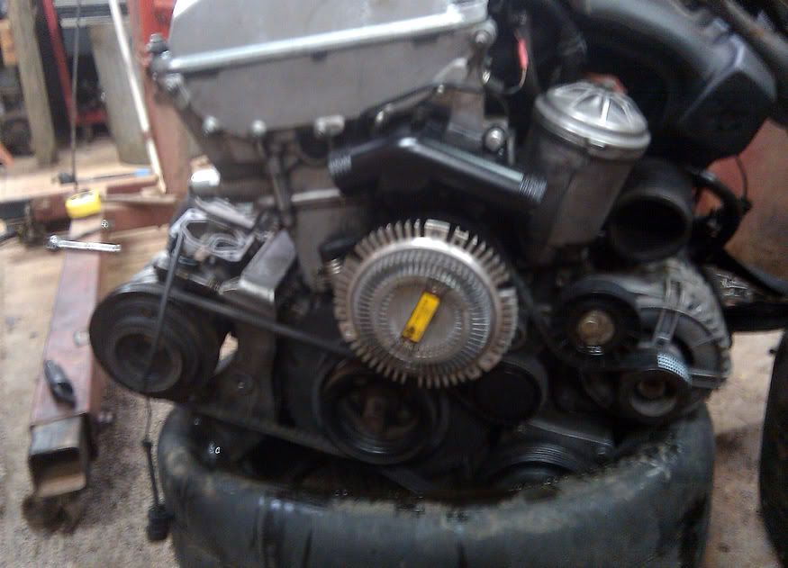 Since the engine we bought did not come with an AC compressor or brackets, I modified the existing m50 brackets to fit the M42 compressor. It has a spring tensioner, and it fits pretty well! I swapped over the M42 outer crank pulley as well. Bolted right on.