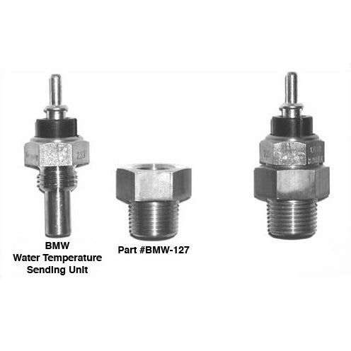 Using the BMW water temperature sending unit in the Chevrolet engine will make the BMW water temperature gauge read accurately. The BMW water temperature sending unit has a 14mm x 1.5 thread. Stealth Conversions has a brass adapter (shown above) that accepts the BMW water temperature sending unit, and has a 3/8 pipe th