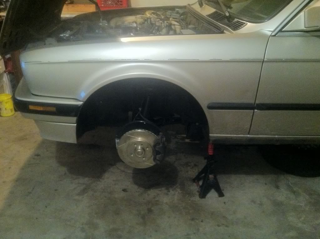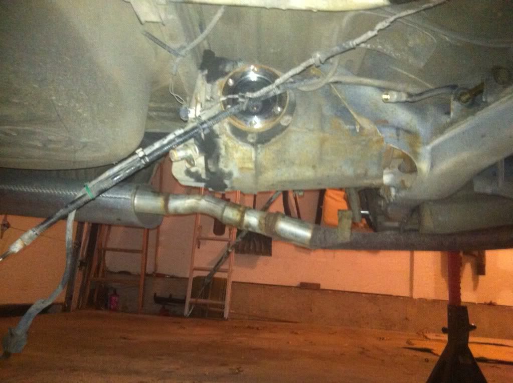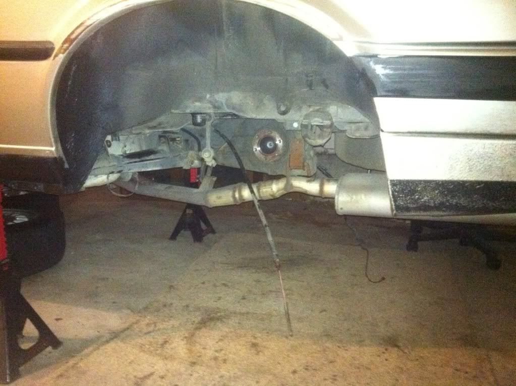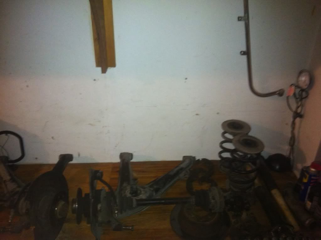 I then started on the rear end, originally i was going to drop the sub frame, but didn't want to remove the exhaust as i have no means of drilling out the old studs and putting new ones in. So i bypassed that and just pulled the trailing arms. this is where i first discovered that my e-brake shoes were 22 years old missing half of the pad and had cracks all over them, and that my shocks are blown ( I can compress them by hand with EASE). i got both of them out in like 3 hours but didn't take any pics as i was working, and didn't want to stop. I did take pics of the after math though.