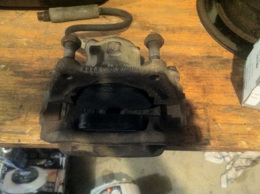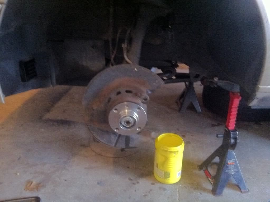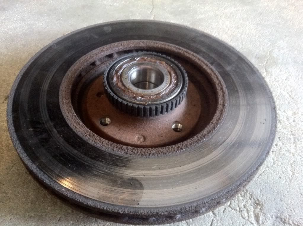 That concluded friday night, then i started on the front, my goal was to replace everything up there today and I did it. First thing i did was remove the caliper with the brake like attached as i am going to bleed the system. I then went to remove the rotor to get the my hub/bearing gave the rotor a good tug and got this.