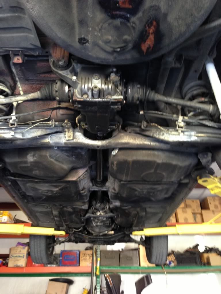 We notched the trans mount on the drivers side and added a gusset to clear the downpipe, not totally necessary but I wanted as much clearance underneath as possible and the e30 body isn't very accommodating for an exhaust pipe on that side. The exhaust was made so its two removable sections. If you ever have to remove it (I've had to twice) you'll thank yourself for paying the extra $100 in V-bands or $20ish for flanges/ gaskets. The chassis brace in the middle that crosses the tunnel now doubles as an exhaust hanger/ brace. This makes it so you can detach the v-bands and let center section hang then simply unbolt it from the body. No rubber donuts to wrestle with, unfortunately I do not have pictures of that.Comment