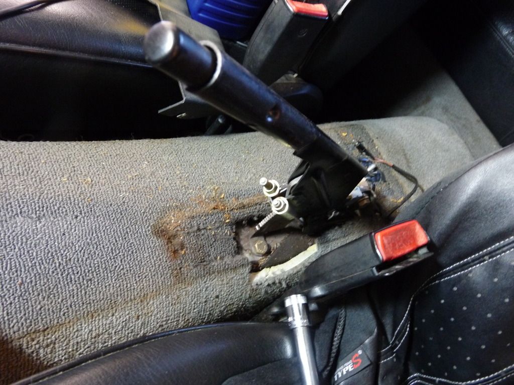 First off, I removed the console and cut away a small bit of carpet around the E-brake handle: