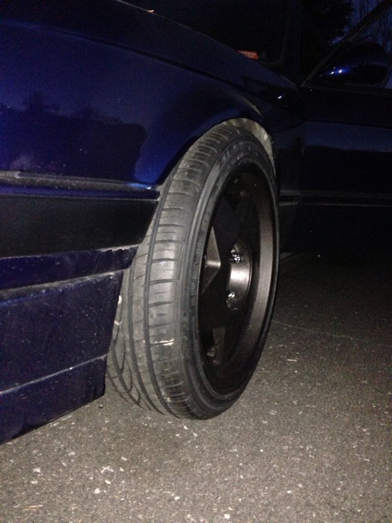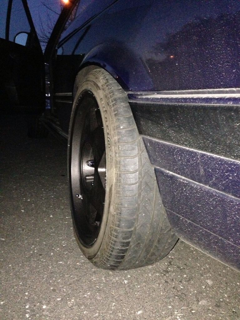 Screw it, I'll re-torque them tomorrow. The lugs cleaned out the holes where they go, but I didn't wanna deal with stripping the whole backs. I got the wheels on today. Had to raise my coils up in the front to accomadate the lower offset, but it still rubs well before full lock. I'll get them re-pulled next weekend. Hopefully I can work the rear enough to go 1/2-3/4" lower back there too. Maybe up my damping and fuck with the inner fenders as much as possible.