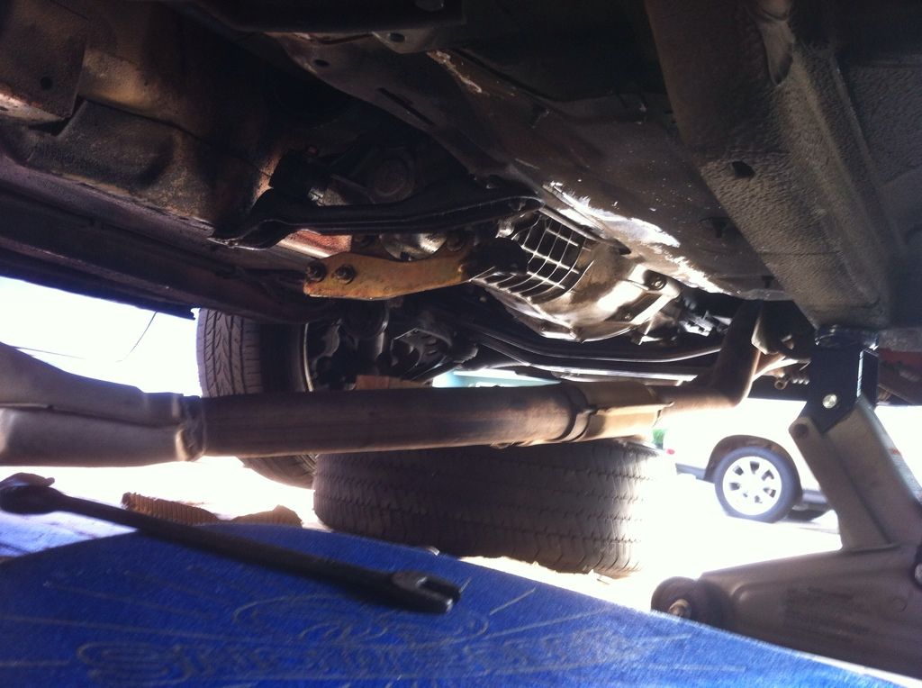 Whoa no updates in a while. Well, when we removed the diff, we accidentally pulled off the back of the driveshaft, not realizing how much of a bitch it is to get back in. So we had to take the entire exhaust off from the headers and drop it down to line up the driveshaft correctly. This has been taking a while, but we finally got it all off and we're pushing the driveshaft back on. It's kinda a PITA to push on though...