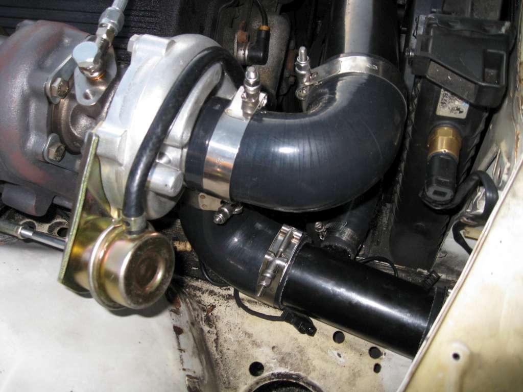 Everything else went on pretty easily, but i had to shorten a few of the pipes and generally cram it in. The area around the turbo is obviously very tight. You have the compressor inlet and outlet, oil return, bypass valve, and radiator lines in very close proximity, so it takes some work to get it to fit.