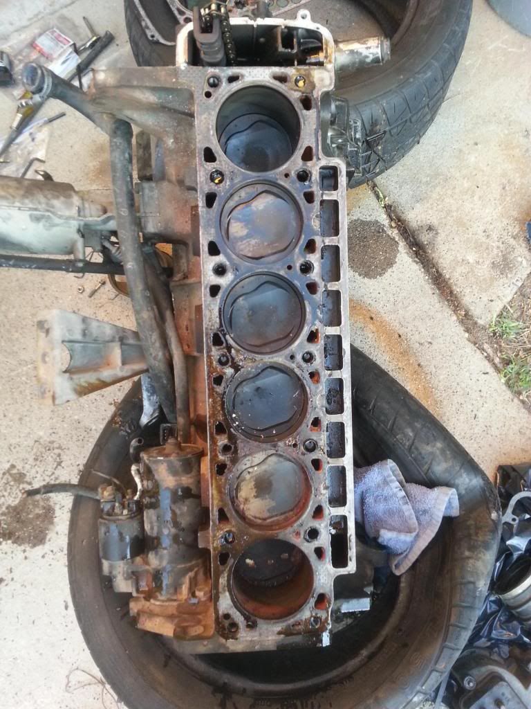 So i started the tear down on the engine last night i took a few pics. I was more curious what the damage was to the engine and i got to say i am one lucky SOB with this. My suspicion was right. All that was wrong was a head gasket. I am still going to rebuild the engine for obvious reasons but as far as best case scenarios this is a pretty good one for an engine that only cost me $90.00.