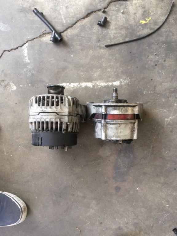 Alternator died a couple days ago. Hit up the yard and grabbed a 115amp alternator from a late 90s e420. Direct bolt on to the factory 190d mount. Just had to upgrade to some beefier wiring and swap pulleys.