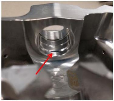 We also observed a deep groove on the opposite pin tower that indicated that the pin ran significantly shifted over in the pin bore towards the side of the failure. The arrow in the picture