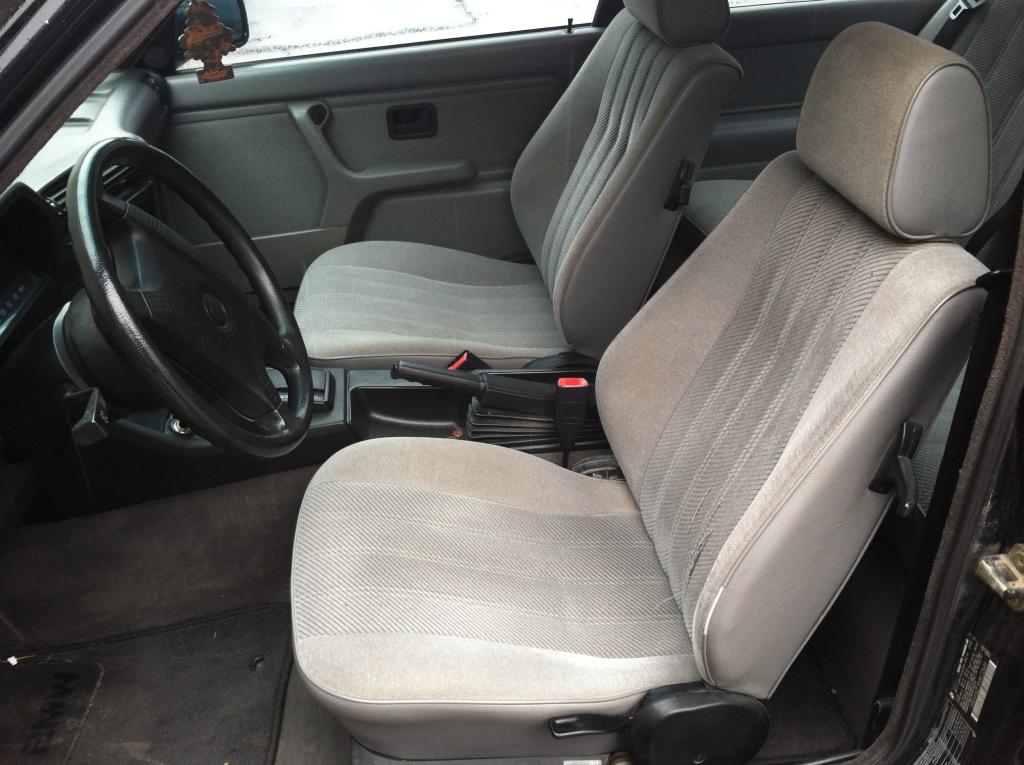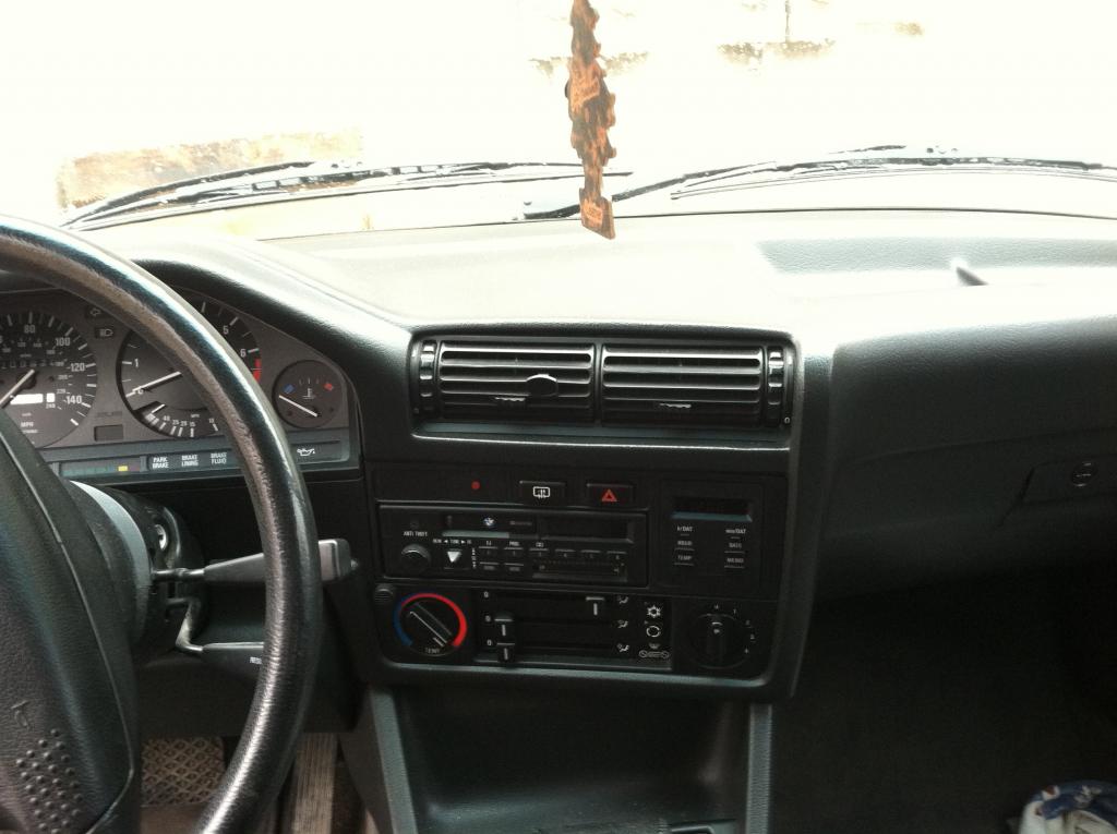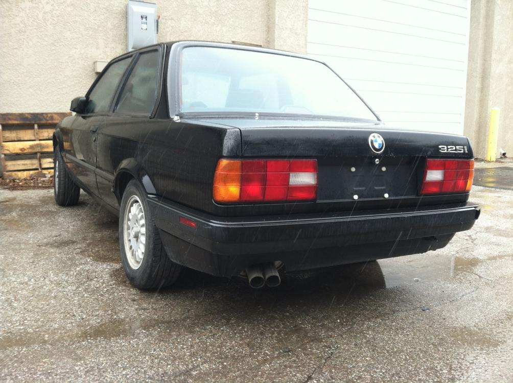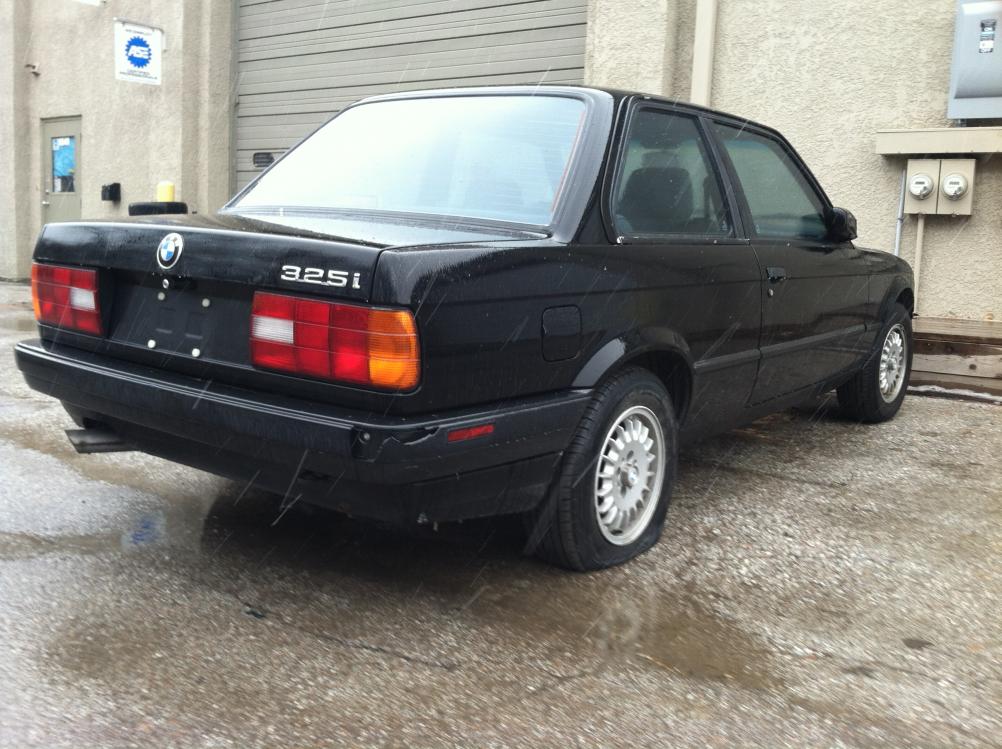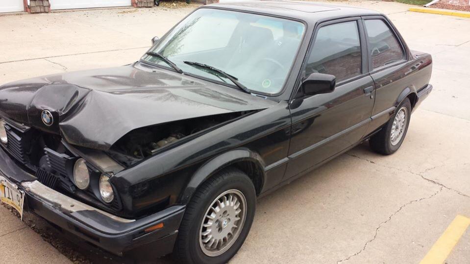 Here is my recently purchased 91 325i. The story is that this was a well loved car that had some bad luck. While driving through a parking lot the PO was hit head on by someone. He didn't want to fix it but the bone yard is no place for a car like this, so I picked it up cheap and have been sourcing parts for its resurrection. The damage is 90% cosmetic so I haven't done much other than find parts. The one thing that has been a pain had been moving the radiator support back into place as it was pushed back far enough to break the fan with the radiator.