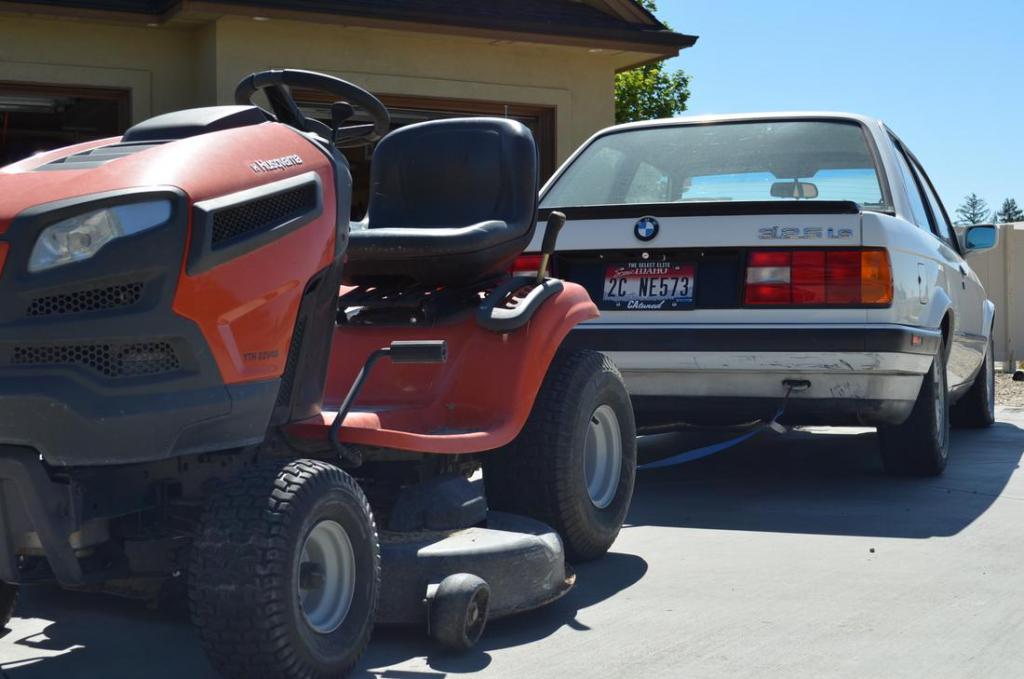 Towing the car out of the sun and into the garage with my trusty tractor.