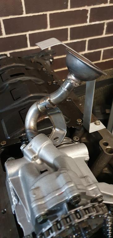 Fitted an oil pump chain tensioner. This will complement the new crank sprocket and custom 7 bolt m54 oil pump modified to work on m50/m52 motors - this was a custom job from finland. Before removing the e34 pump and pickup, i made a jig to mark where the oil pickup was so i could get the new setup in the same location. I used a 728i front oil pickup which needed to be shortened slightly and re-welded.