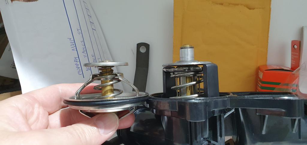 Modified an m54 thermostat to work with m50 head. basically involves removing the spring from under the bypass plate and creating a spacer to hold the bypass plate down under the circlip. This gets the bypass plate to the same position as a stock m52 thermostat. Without doing this, the bypass port would be constantly blocked. Taking the gasket out of the m54 thermostat and placing on the m50 head seems to indicate it will seal.
