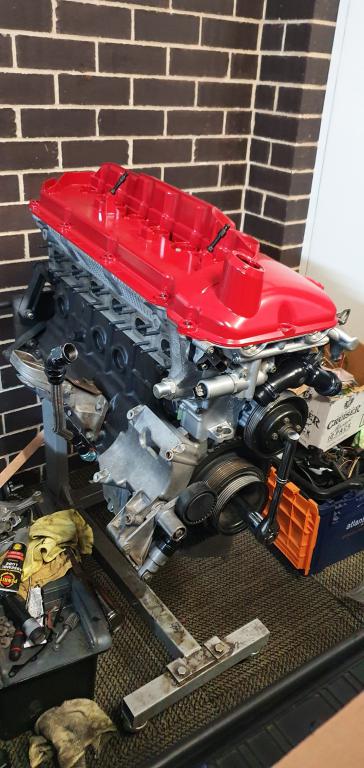 Cams in and timed. Dual Vanos unit mounted and m56 valve cover painted in zinnoberrot to match the body paint.
